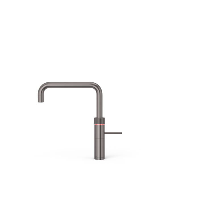 Kokendwaterkraan en mengkraan in een, met kindveilige dubbel-druk-draai bedieningsknop voor kokend water en een rechte hoekige uitloop.